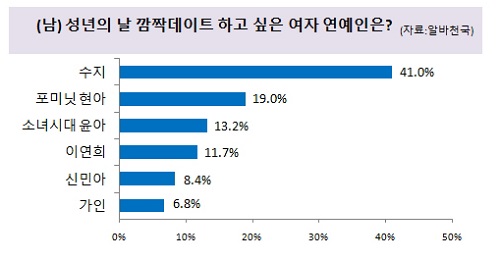 대학생 50.9%, ‘장미 향수 키스 중 1개도 못 받았다’ 아르바이트 전문포털 알바천국(대표 최인녕 www.alba.co.kr)이 전국 남녀 대학생 1,707명을 대상으로 실시한 ‘성년의 날 의식조사’에서 ‘깜짝 데이트하고 싶은 최고의 연예인’으로 남학생들은 ‘수지’를, 여학생들은 ‘송중기’를 각각 1위로 꼽았다.
