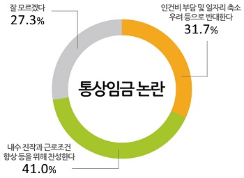 통상임금에 상여금 포함여부를 놓고 6월 임시국회에서 논란이 이어질 것으로 예상되는 가운데 국민 여론은 찬성이 반대보다 다소 많은 것으로 나타났다.