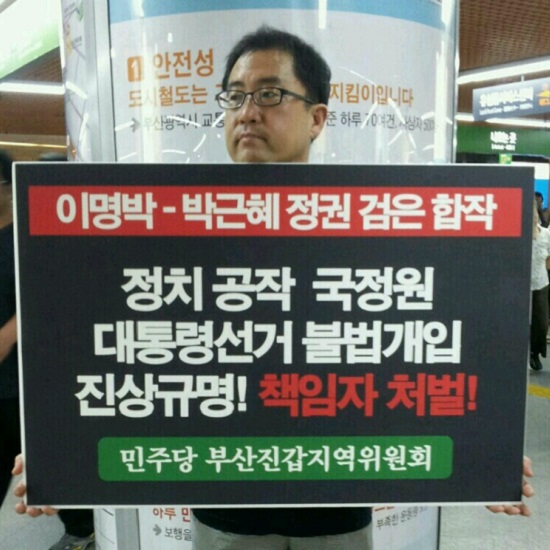 새누리당과 민주당 원내지도부들이 6월 임시국회를 종료한 2일 밤 '폭탄주'회동을 가져 논란이 일고 있는 가운데 민주당 부산진갑지역위원회(운영위원 송만정 사진)는 3일(수) 오후 5시부터 부산 서면 지하철 환승역에서 국가정보원 대선 불법개입 진상규명과 책임자 처벌을 촉구하는 1인 시위를 벌였다.