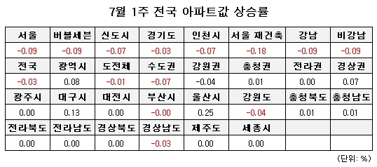 전국 -0.03%, 서울 -0.09%, 수도권 -0.07% 전국 아파트값이 -0.03%로 6주 연속 하락했다.