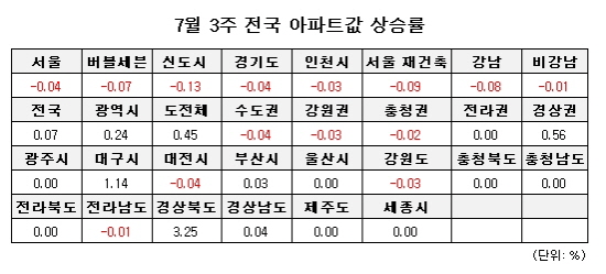전국 0.07%, 서울 시 -0.04%, 수도권 -0.04%, 5대 광역시 0.24%, 도지역 0.45%