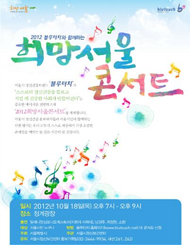 서울시는 18일(목), 청계광장에서 서울시 정신건강브랜드 블루터치(blutouch) 문화페스티벌 일환으로 ‘2012 블루터치와 함께하는 희망서울 콘서트’를 개최한다.