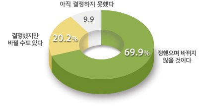 여론조사 전문기관 모노리서치(대표 이형수)가 10월 15일 실시한 대선 관련 정례/기획조사에서 응답자 69.9%는 ‘지지후보를 결정했으며 바뀌지 않을 것’이라고 답했다. 20.2%는 ‘지지후보는 결정했지만 바뀔 수도 있다’고 응답했다. 9.9%는 ‘아직 결정하지 못했다’고 밝혔다. 성별로는 ‘결정/바뀌지 않음’에 남성 74.1%, 여성 65.8%, ‘바뀔 수 있음’에 남성 17.8%, 여성 22.5%, ‘결정 못함’에 남성 8.1%, 여성 11.7%의 응답률이 나왔다. 남성보다 여성이 아직 지지후보를 결정하지 못하고, 변화 가능성도 큰 것으로 나타났다. 연령별로는 ‘결정/바뀌지 않음’에 60대 이상(79.3%)과 50대(75.3%)에서 가장 응답률이 높았고 30대(60.8%)와 20대(63.5%)에서 가장 낮았다. 가장 큰 변수로 주목받고 있는 40대에선 ‘결정/바뀌지 않음’ 70.9%, ‘바뀔 수 있음’ 21.0%였다. 특히 ‘바뀔 수 있음’ 응답에서 30대는 33.1%, 20대의 17.5%는 ‘결정 못함’ 응답을 하는 등 연령대가 낮을수록 선택에 더 신중한 모습을 보였다. 지역별로는 경북권(79.2%)와 충청권(76.2%)에서 ‘결정/바뀌지 않음’ 응답률이 높은 반면 경기권(65.0%)과 서울권(65.1%)은 낮은 응답률을 보였다. ‘바뀔 수 있음’ 응답 역시 경기권(24.3%)과 서울권(23.9%)에서 가장 높았으며 전라권(22.2%)에서도 높은 응답률을 나타냈다. 중요 격전 지역으로 손꼽히는 경남권에서는 ‘결정/바뀌지 않음’ 75.8%, ‘바뀔 수 있음’ 14.8%, ‘결정 못함’ 9.4%였다. 정당지지도별로는 새누리당 지지응답자들의 82.7%가 ‘결정/바뀌지 않음’ 응답을 한 반면 민주통합당 지지응답자들은 65.8%에 그쳤다. ‘바뀔 수 있음’은 민주통합당 지지응답자 25.9%, 새누리당 지지응답자 11.4%가 응답했다. 대선주자 다자대결 대선주자 다자대결에서는 박근혜 새누리당 후보가 43.3%로 지난 9월 26일 직전 조사 대비 2.9% 포인트 상승하며 수위를 지켰다. 이어 안철수 무소속 후보가 직전 조사 대비 2.4% 포인트 하락한 24.7%, 문재인 민주통합당 후보가 0.8% 포인트 상승한 23.7%의 지지율을 나타냈다. 이어 이정희 통합진보당 후보가 직전 조사 대비 0.5% 포인트 하락한 0.3%, 이번에 처음 조사한 심상정 진보정의당 후보는 0.4%, 기타 후보는 1.1%였다. 대선주자 양자대결 대선주자 가상 양자대결에서는 ‘박근혜-안철수’ 대결의 경우 안철수 후보 48.2%, 박근혜 후보 43.1%로 안 후보가 박 후보를 5.1% 포인트 차이로 앞섰다. 직전 조사에서도 안 후보는 박 후보에게 5.0% 포인트 차이로 앞섰다. ‘박근혜-문재인’ 대결은 박근혜 후보 47.9%, 문재인 후보 44.3%로 박 후보가 문 후보를 3.6% 포인트 앞섰다. 직전 조사에서는 1.3% 포인트 차로 박 후보가 문 후보를 앞섰다. 야권단일후보 적합도 야권단일후보 적합도 조사에서는 문재인 후보 46.0%, 안철수 후보 35.1%로 문 후보가 안 후보를 10.9% 포인트 차이로 앞섰다. 직전 조사에서는 8.9% 포인트 차이로 앞섰다. 야권단일후보 적합도 조사에서는 야권 지지 성향 외 응답자들의 ‘잘 모름’ 답변이 많았다. 전체적으로 18.9%의 ‘잘 모름’ 응답률을 보였다. 군소후보 변수 여부 이번 정례/기획조사에서는 박근혜, 문재인, 안철수 후보 등 유력 대선주자 외 소위 군소후보들의 득표율이 대선 결과에 변수로 영향을 미칠 것인지 의견을 물었다. 63.4%가 ‘부정적’(변수가 되지 않을 것 54.3%, 전혀 변수가 되지 않을 것 9.1%), 30.3%가 ‘긍정적’(다소 변수가 될 것 22.5%, 큰 변수가 될 것 7.8%)인 응답을 했다. 정당 지지도 한편 정당지지도 정례 조사에서는 새누리당 42.1%(3.8%p▲), 민주통합당 30.8%(3.9%p▼), 통합진보당 2.0%(0.1%p▲), 진보정의당 0.4%, 선진통일당 0.2%(0.4%p▼), 기타정당 2.8%(1.5%p▼), 무당층 21.7%(1.5%p▲) 등이었다. 민주통합당은 최근 지지도 상승세를 탔으나, 이번 조사에서는 다소 주춤했고, 새누리당은 다시 지지율이 올라가는 모습을 보였다. 조사를 진행한 모노리서치의 이재환 책임연구원은 “본격적인 선거전이 시작되면서 박근혜 후보는 정수장학회 논란 및 당내 내홍, 안철수 후보는 논문 표절 의혹 등 잇따른 도덕성 문제제기, 문재인 후보는 노무현 정부 시절의 서해북방한계선 발언 논란 등의 이슈가 제기됐으나 각각 지지율 변동은 크게 없었다”며 “각 후보들의 지지층 결집이 거의 최고조에 이르렀다는 분석과 함께 결국 향후 부동층 공략이 관건으로 남은 상황”이라고 밝혔다. 이어 “네거티브 공세가 상호 심화되더라도 시간적으로나 지지층 결집도 면에서 지지율의 급격한 변화가 있을 것이라고 예측하기 어려운 상황”이라며 “현 시점에서 예측 가능한 가장 큰 지지율 변화 요인은 여당과 야권 모두 야권단일화 여부가 될 것”이라고 전망했다. 이번 조사는 10월 15일 전국 19세 이상 남녀 1,302명을 대상으로 일반전화 RDD(무작위 임의걸기) IVR(ARS) 방식으로 조사했으며 성별, 연령별, 권역별 인구비례에 따라 가중치를 부여했다. 표본오차는 95% 신뢰수준에서 ±2.71%p이다.