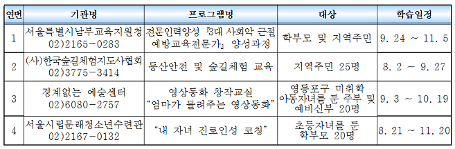 ‘영등포 특성화 평생학습프로그램’은 지역의 특성과 주민의 생활권 등을 고려해 평생학습프로그램을 마련·제공함으로써 주민들에게 다양한 학습기회를 제공하고 관내 평생학습문화를 확산시키기 위해 마련된 것이다. 선정된 프로그램은 ▲3대 사회악 근절 예방교육전문가 양성과정 ▲등산안전 및 숲길체험 교육 ▲영상동화 창작교실 “엄마가 들려주는 영상동화” ▲내 자녀 진로인성 코칭 등 총 4개 프로그램이다.