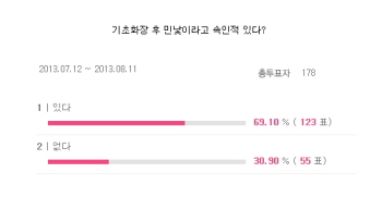 미앤미의원 피부 홈페이지 방문자를 대상으로 7월 한달 간 진행한 설문조사에서 ‘기초 화장 후 민낯이라고 속인 적이 있다?’라는 질문에 전체 응답자 178명의 약 70%(123명)가 ‘있다’고 답했다. 기초화장이란 스킨 로션과 자외선 차단제를 바른 상태인데, 대부분 이 외에 메이크업 베이스나 BB크림까지 바른 상태도 기초 화장이라 이야기한다. 아이쉐도우나 마스카라 등 별도의 색조화장을 하지 않은 상태지만 기본 화장을 한 상태로 민낯이라고 보기엔 무리가 있다. 여성의 70%나 이런 거짓말을 한 이유는 무엇일까? 전문가들은 화장을 하지 않은 듯 자연스러운 얼굴이 동안의 상징이 되기 때문이라 전한다. 화장을 하지 않아도 화장한 것 처럼 피부결이 부드럽고 뽀얗다는 것은 그만큼 동안으로 여겨지기 때문에 이렇게 보이고 싶어하는 여성들이 많은 것이다. 미앤미의원 김재훈 원장(영등포점)은 “가벼운 기초화장 만으로도 피부톤이나 피부결이 깨끗해 보이려면 여드름흉터나 여드름치료, 점과 기미 잡티 등과 같은 색소질환 치료가 필요한 경우가 많다. 여드름이나 기미는 치료하지 않을 경우 자연적으로 소실되기 힘들기 때문에 전문가를 찾아 상담을 받고 치료를 받을 것을 권하는 편이다”라고 설명했다.