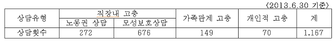 상반기에 77%(354명)가 시차출퇴근제를 이용한 것으로 나타났으며, 근무시간선택제가 149명, 시간제근무 14명, 재택근무제 등 77명이었다. 서울시는 이는 아이들을 학교나 어린이집, 유치원에 보내고 출근하거나 일찍 퇴근해 아이들을 돌보는데 가장 적합해 직원들이 선호하는 것으로 분석하고 있다. 이와 관련해 서울시는 유연근무의 일상화를 위해 직원들을 대상으로 지난 6월 유연근무제 체험수기를 공모해 8편을 선정, 시상하고, 만화(웹툰) 형식으로 제작해 내부 게시판을 통해 직원들과 공유하기도 했다. 대표적인 사연을 들여다보면, 아들 둘을 키우는 김지형 주무관(남)은 유연근무제 이전과 이후의 세계가 나뉠 정도로 시차출근제의 덕을 보았다. 아침에 1시간 여유가 생기면서 아이들을 직접 깨우고 아침밥을 먹이고 유치원에 데려다주면서 가족분위기도 너무나 화목해졌다. 마음의 여유가 생기다보니 일의 능률도 더 올라 이제는 유연근무제 전도사가 되었다. 딸 둘을 키우고 있는 손형기 주무관(남)은 제도 시행 초기인 2008년 딸아이가 아파 주 3일 병원에 가야하는 처지에서 유연근무제를 활용해 아이를 돌볼 수 있었고, 그 아이가 자라 이제는 건강한 6살이 되었다. 손 주무관은 이제 유연근무제 참여 전에는 꿈도 못 꿨던 셋째 아이 출산계획을 세우고 있다. 서울시는 앞으로도 유연근무의 활성화를 위해 참여인원을 계속 확대한다는 계획이며, 매년 10%씩 늘려 2014년에는 2,000명(20%)을 유연근무에 참여시킨다는 목표다. 서울시는 이외에도 일․가정 양립을 위한 제도로 ‘출산전후 여성공무원 9to5 근무제’, ‘출산휴가 및 육아휴직자를 위한 대체인력제도’, ‘서울시직장맘지원센터’ 등을 운영하고 있다. ‘서울시직장맘지원센터’는 지난해 4월 마포구에 문을 열고 직장맘의 노동권과 모성보호를 위해 상근 노무사가 온(www.workingmom.or.kr)․오프라인을 통해 상담을 실시, 직장맘의 고충이 실질적으로 해결될 수 있도록 지원하고 있다. 상담은 예방, 심층, 확인상담의 3단계로 이뤄지고 상근 노무사가 직접 코칭의 방식으로 밀착 상담·지원하고 있다. 지난해 4월 개관 이후 센터는 지금까지 총 1,167건의 상담을 통해 출산과 육아로 해고 위기에 있던 직장맘들을 지원해왔다. 전체 상담과 분쟁 해결 건수 중 약 81.2%가 출산휴가, 육아휴직 등 노동권과 모성보호에 해당하는 직장 내 고충에 대한 상담이다.