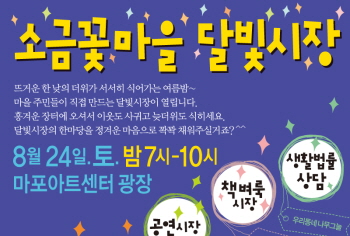 서울시 마포구 대흥동에 위치한 마포아트센터 광장에서 8월 24일(토) 저녁 7시부터 10시까지 염리동 주민들이 직접 만든 생활공예 제품과 먹거리 판매, 주민체험마당 및 벼룩시장, 문화공연 등이 어우러진 ‘소금꽃마을 달빛시장’이 열린다.