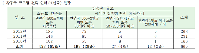 2012년 11월 제정된 「강동구 에너지조례」를 근거로 마련된 가이드라인은 건축물 설계단계부터 환경 친화적이고 에너지 저소비형 건축물 건립을 유도해 온실가스 감축, 원전하나 줄이기, 전력난 완화 등 전 지구적 에너지 위기 대응에 동참한다는 계획이다. 정부가 추진 중인 「녹색건축물 조성 지원법」의 하위 법령들의 정비가 완료됨에 따라 오는 9월부터 단독주택을 제외한 바닥면적 500㎡ 이상의 모든 건축물은 ‘에너지절약계획서’를 제출하도록 하고 있다. 이에 강동구는 규모가 상대적으로 작은 자치구 심의대상 건축물에 대해 차등·세분화한 기준을 마련해 현실화하고 에너지절약계획서 제출 대상이 아닌 소규모 건축물에 대해서도 가이드라인을 적용해 정책의 실질효과를 높이도록 했다. 연면적 500㎡이상 모든 건축물(단독주택 제외)에 대해서는 법적 기준보다 대폭 설계기준을 강화한 ‘2013년 서울특별시 녹색건축물 설계기준’을 준용하되 상대적으로 규모가 작은 자치구 심의대상 건축물에 대해 차등·세분화된 기준을 마련했다. 연면적 3,000㎡이상 또는 50세대 이상의 건축물에 대해 서울시의 강화된 녹색설계 기준을 적용해 의무화했다. 또한 상대적으로 규모가 작은 연면적 500㎡~3,000㎡미만 또는 50세대 미만의 건축물에 대해서는 절감기술 등 일부 항목에 대해 의무화하고 나머지는 자율적용을 유도할 계획이다. ‘연면적 500㎡~3,000㎡미만 또는 50세대 미만의 건축물’과 에너지절약계획서 제출 대상이 아닌 ‘연면적 500㎡미만의 건축물과 단독주택’에 대해 강동구가 2009년부터 시행하고 있는 강동구 저탄소·Green에너지·친환경건축물 성능향상 기준을 강화해 4개 분야로 나누어 가이드라인을 제시했다. 최근 3년간 강동구 지역의 신축 건축물을 보면 94% 강동구 규모별 건축 인허가(신축) 현황