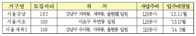 이중 신규물량은 총 448호로 보금자리주택지구 서울강남 192호, 서울서초 100호, 서울세곡2 156호이다.