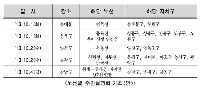 서울시 도시철도 기본계획 변경(안)에 대한 시민공청회 9월 26일 개최 서울시는 지난 7.24 「서울시 도시철도 종합발전방안」에 대한 기자설명회 시 예고한 바에 따라,『서울시 도시철도 기본계획 변경(안)』에 대한 시민공청회, 주민공람, 주민설명회 등의 법정절차를 오는 9월과 10월 중에 진행한다고 밝혔다.