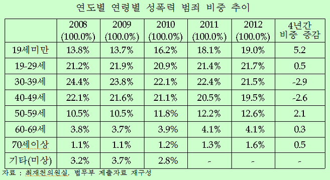 성폭력 범죄 지속적 증가, 10대와 70세 이상 증가율 가장 높아 국회 예산결산위원회 민주당 간사인 최재천의원실에서 법무부에 자료를 요청하여 분석한 결과 성폭력 범죄 발생 건수가 2008년부터 2012년까지 5년동안 높은 증가율(37%)을 보여 시민안전 특히 여성들의 안전에 빨간불이 켜진 것으로 확인되었다. 성폭력사범 발생 증가율을 연령대별로 살펴보면 70세 이상이 109%의 증가율을 보여 가장 높게 증가하였으며, 19세미만이 88.6%로 두 번째, 50대가 64.4%로 그 뒤를 이었다.