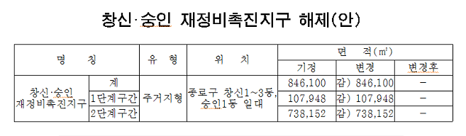 촉진구역 해제 대상지는 주택재개발구역 6곳(창신9~12재정비촉진구역, 숭인1~2재정비촉진구역), 도시환경정비구역 8곳(창신1~8재정비촉진구역)이 있다.