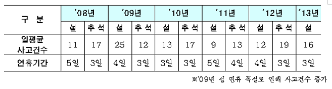 자가용 승용차를 이용하는 시민의 경우 ‘명절 당일 10시~14시와 18시’ 도시고속도로를 피하고 기차나 고속버스를 이용할 시민이라면 4일째 휴일인 ‘21일(토) 오후’를 피하는 것이 좋겠다. 먼저 명절기간은 한꺼번에 많은 차량이 이동하는 만큼 사고도 많이 발생하니 각별한 주의가 필요하다. 연휴 중에서도 특히 성묘, 나들이, 친지 방문 등으로 차량이 집중되는 ‘명절 당일’은 더욱 조심해야 한다. 서울시가 최근 5년간 설․추석 연휴기간 동안 도시고속도로에서 발생한 교통사고를 분석한 결과, ‘명절 당일’ 평균 사고 발생건수는 23건으로 명절 전날과 다음날 평균인 12건보다 약 2배 많았다. 연휴가 길수록 차량이 분산돼 교통사고는 적게 발생하는 것으로 나타났다. 5일로 길었던 ’08년과 ’11년 설 연휴동안 일평균 사고건수는 10건이었던데 반해 연휴가 3일 밖에 안됐던 ’08년 추석을 비롯한 6번의 명절 사고 평균은 16건인 것으로 나타났다.