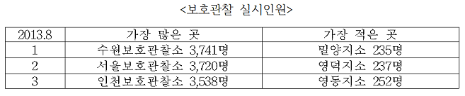 보호관찰 실시인원이 가장 많은 곳은 수원보호관찰소로 3,741명이었으며 가장 적은 곳은 밀양지소로 235명이었으며 전담인원 1인당 보호관찰인원이 가장 많은 곳은 의정부보호관찰소로 287명, 가장 적은 곳은 공주지소로 104명이었다. (2013년 8월 기준)