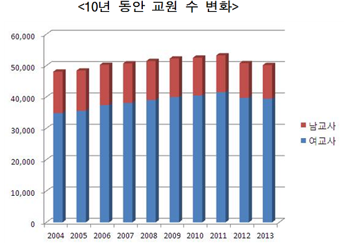 그랬더니 2004년도에 72.5%(35,584명)에 이르던 여성교원의 비율이 꾸준하게 높아져서, 2013년 현재 78.65%(39,457명)에 육박하고 있었다. 하지만, 남성교원은 10년 동안 2,500명 정도 감소했다. 초등학교와 중학교의 여성교원도 꾸준히 증가했지만, 고등학교에서 여성교원의 증가폭이 커졌음을 알 수 있었다. 또한 관리직 여성교원(교장, 교감)의 수도 꾸준히 증가하여, 2004년에 10명 중 2명 수준(23.1%, 468명)이었던 여성 관리직 교원이 현재는 10명중 4명 수준(42%, 888명)이었다. 2004년에 48,078명이었던 교원 수는 2013년에 50,167명으로 약 2,089명이 증가하였다. 전체 교원 수의 변화에 비례하여, 10년 동안 여성 교원은 꾸준히 증가하여 4,588명이 늘었고, 반대로 남성 교원은 꾸준히 감소하여 2,499명이 줄었다. 그 결과 여성교원의 비율은 2004년 72.53%에서 78.65%까지 높아졌고, 10명 중 8명이 여선생님인 상황이 되었다.