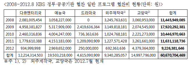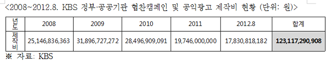 민주통합당 문화체육관광방송통신위원회 소속 신경민 의원(영등포을)이 KBS로부터 제출받은 국정감사 자료를 분석한 결과, 지난 5년간 KBS가 정부 및 공공기관으로부터 받은 캠페인 및 공익광고 협찬금이 1,231억 원, 일반 프로그램의 제작 협찬금은 606억 원으로 총 1,837억 원 이상인 것으로 확인됐다.