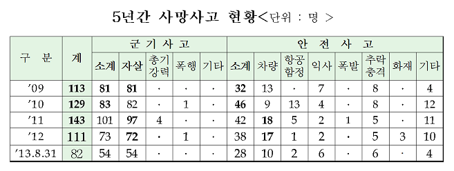 특히 군기사고는 2011년의 총격사고 4건과 2010·2012년에 각각 1건씩 있었던 폭행사고를 제외하고 전부 자살이었던 것으로 드러났으며 안전사고로 인한 사망 중 압박, 뜀걸음, 행군, 실족, 감전사 등 기타원인도 총 41건으로 안전사고의 약 22%에 달했다. 신분별 자살사고 현황을 보면 지난 5년간 스스로 목숨을 끊은 386명 중 약 60%인 233명이 병이었던 것으로 나타났다. 2009년에 약 66.7%를 차지했던 사병의 비율은 지속적으로 감소하여 2012년에 52.8%까지 감소했으나, 2013년 8월 현재 다시 증가하여 57.4%를 차지했다. 신경민 의원은 “나라를 이끌어 갈 20대 젊은이들이 군대에서 스스로 목숨을 끊는 우리의 아픈 문화가 여전히 해결되지 않고 있다”며 “자살의 원인이 되는 군대 내 폐쇄적 문화에 대해 심도 있는 논의와 자살 비율이 특히 높은 사병들의 정신 건강을 위한 프로그램 마련이 시급하다. 또한 작은 안전 부주의가 사망으로 이어지므로 군대 내 ‘안전대책’을 마련해야 한다”고 강조했다.