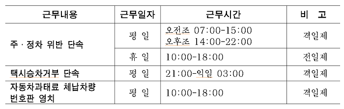 이번에 교통법규 위반 단속분야 시간제계약직 공무원으로 채용되면 내년 3월부터 시내 6차로 이상 도로의 주․정차 위반 차량 및 택시 승차거부 단속, 자동차 과태료 체납차량 번호판 영치 등의 현장 업무를 수행하게 된다.