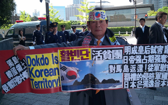 시민단체 활빈단 홍정식 대표와 애국국민운동대연합 오천도 대표가 지난 19일 오전 일왕 황거, 노다 일본총리관저, 자민당 당사등 도쿄 중심부에서 일본의 독도침탈에 대해 항의하는 시위를 펼쳤다.