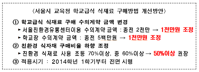 서울시의회 김인호 재정경제위원장은 12일 보도자료를 통해 서울시 교육청이 2014학년 1학기부터 전면시행한다고 발표한 ‘학교급식 식재료 구매 수의계약 금액 변경’, ‘친환경 식자재 구매비율 하향 조정’등은 학생의 건강을 담보로 한 위험천만한 도박이라고 강하게 비판했다.