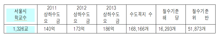 그런데 서울시 교육청이 학교 화장실 등 1,326개학교 168,166개 수도꼭지를 조사한 결과 31%인 51,873개가 기준을 어기고 있는 것으로 드러났다. 뿐만 아니라 서울시의 자료에 의하면 1,691개의 공중화장실 수도 시설 중 75%인 1,277개만이 절수설비가 설치되고 25%인 414개는 수도법을 위반하고 있는 것으로 조사되었다.