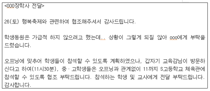 그 밖에도, 한 지역교육청은 학생행복축제를 개최하면서 학교별로 100명 정도의 학생을 할당하기도 했다. 학생이 준비하고 기획한 행사라고는 하지만, 인원을 강제로 할당한 부분은 지양해야 맞지 않을까? 마지막으로 S학교는 지역교육청 담당 장학사로부터 다음과 같이 ‘행복축제’라는 이름으로 학생참여를 요하는 업무메일을 받아 학생과 교사들을 교육감의 사전 선거운동에 동원하는 것이 아니냐는 얘기마저 나온다. 학생동원은 가급적 하지 않으려고 했는데.. 상황이 그렇게 되질 않아 ooo에게 부탁을 드렸습니다. 오프닝에 맞추어 학생들이 참석할 수 있도록 계획하였으나, 갑자기 교육감님이 방문하신다고 하여(11시30분), 중·고학생들은 오프닝과 관계없이 11까지 S고등학교 체육관에 참석할 수 있도록 협조 부탁드립니다. 참석하는 학생 및 교사에게 전달 부탁드립니다. 감사합니다.