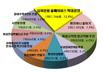 이어, 동별로 국공립어린이집을 2개 이상 확충해 보육 수요를 충족하고 보육 공공성을 확대하는 ‘국공립어린이집 확충(730표, 5.3%)’이 4위, 개인 간병인을 두거나 보호자가 직접 보호하지 않고도 환자가 입원생활을 유지할 수 있는 ‘환자안심병원(721표, 5.2%)’이 5위에 올랐다.