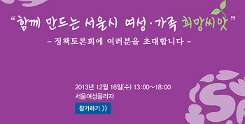 12월 18일(수) 오후1시~6시 서울여성플라자(동작구 대방동) 4층 시청각실·아트3실·아트5실에서 ‘함께 만드는 서울시 여성가족 희망씨앗-시민이 함께 만들어가는 서울시 여성가족정책’ 종합 토론회를 개최한다고 서울시여성가족재단이 17일(오전) 밝혔다. 이번 토론회는 서울시민이 체감하는 성평등 정책 만들기 △다양하고 평등한 맞춤형 가족정책 만들기 등 총 6개의 주제와 과제 등에 대해 각각 재단 연구진의 주제발표가 있은 뒤 여성단체·행정·유관기관 참석자들의 토론이 진행된다. 서울시 여성가족정책의 씽크탱크로, 올 한 해 동안 서울 여성과 가족의 희망을 실현하기 위한 많은 정책연구를 수행해온 서울시여성가족재단의 이숙진 대표는 “연구결과로 나온 서울시 여성가족현황, 이슈 및 정책제언을 정책의 수요자인 시민을 비롯해 여성단체, 현장 실무자, 연구자, 행정 등과 공유하고 실제 시민에게 필요한 정책으로 현실화하기 위한 방안을 함께 논의하기 위해 토론회를 준비했다”며 “일년 간의 노력이 모아진 희망씨앗이 시민이 체감하는 여성가족정책으로 열매 맺을 수 있도록 관심 있는 시민 여러분의 많은 참여를 부탁드린다.”고 밝혔다