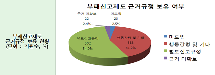 부패신고를 위한 내부규정을 보유한 기관은 총 885개(95.2%)이나, 이 중 신고규정을 별도로 제정한 기관은 502개(54.0%)에 불과했다. 나머지 기관은 공직자 행동강령이나 감사규정에 혼재된 것으로 응답하는 등 신고접수절차를 명확하게 규정하지 못한 곳도 많았다.