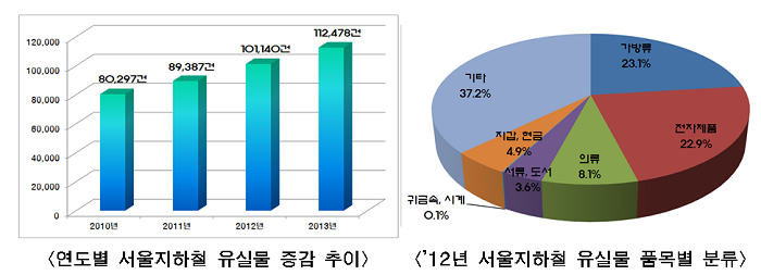 지난해 접수된 유실물 중에 ’12년 대비 증가율이 가장 컸던 품목은 의류(15.6%↑)와 전자제품(15.5%↑)이었고, ‘지갑 및 현금’, ‘가방’이 뒤를 이었다.