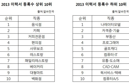이 외에도 이력서수가 가장 적었던 하위 10개 직종을 살펴보면 단순히 시급이 낮고 일이 힘든 직종보다는, ‘자격증·기술’(2,790건), ‘부동산’(3,343건), ‘프로그래머’(3,481건), ‘골프캐디’(4,526건) 등 전문기술이 필요한 직종들이 대다수를 이루고 있는 것으로 나타났다. 이 중 ‘퀵서비스·택배’(6,322건)와 ‘유통·도소매’(4,839건)만이 생산·기능 직종이었다. 반대로 2013년 한 해 동안 지원하는 사람이 가장 많았던 직종은 ‘음식점’(188,333건), ‘까페’(174,348건), ‘커피전문점’(159,826건)' 순인 것으로 나타났다. 상위 3가지 외에도 ‘편의점’(158,269건), ‘레스토랑’(119,130건), ‘베이커리’(104,620건), ‘대형마트’(98,093건), 백화점(96,680건) 등 ‘서빙·주방’과 ‘매장관리’ 업종이 10위권 중 총 9개나 올라 구직자가 가장 많이 지원하는 아르바이트임이 드러났다. 사무회계 직종으로는 ‘사무보조’(144,591건)가 유일하게 상위 10위권 안에 포함됐다. 특히 ‘음식점’, ‘편의점’의 경우는 채용공고 수 순위에서도 각각 1위(932,170건)와 2위(561,007건)를 차지해, 아르바이트 시장에서 구인도 많고 구직도 많은 가장 활성화된 대표 직종으로 꼽혔다.
