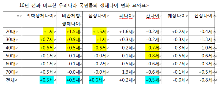 우리나라 국민은 10년 전에 비해 우리나라 국민의 생체나이가 0.5세 많은 것으로 나타났다.