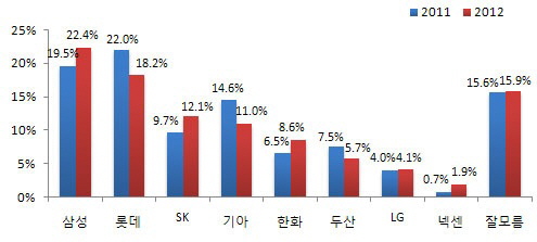4위는 기아 타이거즈로 11.0%를 기록했고, 5위는 올해 박찬호 선수와 김태균 선수의 해외파 영입과 최근 새 감독으로 김응용 감독이 지명된 한화 이글스가 8.6%로 작년 대비 한 단계 상승한 것으로 나타났다. 6위는 두산 베어스로 5.7%, 7위는 LG 트윈스로 4.1%, 8위는 넥센 히어로즈로 1.9%에 머물렀다. 지역별 연고팀 충성도는 전남/광주가 가장 높았다. 전남/광주에서 기아가 68.7%로 1위를 기록했고, 다음으로는 대구/경북에서 삼성이 68.4%를 기록했다. 부산/경남 역시 연고팀인 롯데가 49.2%로 1위를 기록하면서 세 번째로 연고팀 충성도가 높았다. 그리고 대전/충청에서는 한화 이글스가 43.5%로 1위를 기록했고, 경기/인천에서는 20.7%로 연고팀인 SK가 1위를 기록했다. 성별로는 남성 25.0%, 여성 19.9%로 모두 삼성 라이온즈를 1위로 꼽았다. 연령별로는 20대, 30대는 롯데(각각 28.2%, 24.2%), 40대, 50대, 60대이상은 삼성(각각 18.5%, 29.4%, 28.2%)을 가장 선호하는 것으로 나타났다. 한편 현재 진행되고 있는 코리안시리즈에서는 어느 팀을 응원하는가에 대한 조사에서는 응답자의 35.4%가 삼성 라이온즈를 응원하는 것으로 나타내, SK 와이번즈(31.9%)보다 높게 나타났다. 지역별로는 강원, 부산/경남/울산, 대구/경북, 제주지역은 삼성 라이온즈가 더 높게 나타났고, 서울, 경기/인천, 대전/충청, 전남/광주, 전북에서는 SK 와이번즈가 삼성보다 더 높게 나타났다. 성별로는 남성(39.4%), 여성(31.5%) 모두 삼성 라이온즈가 더 높게 나타났고, 연령별로는 30대를 제외한 나머지 연령 모두 삼성 라이온즈가 높게 나타났다. 이번 조사는 10월 25일, 전국 19세 이상 남녀 750명을 대상으로 휴대전화와 유선전화 RDD 방식으로 조사했고, 지역별 인구비례에 따라 무작위 추출후, 통계처리 과정에서 성, 연령, 지역별로 인구비례 가중치를 부여했으며, 표본오차는 95% 신뢰수준에서 ± 3.6%p였다.