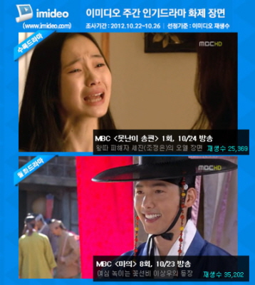 멀티미디어 검색 전문 기업 ㈜엔써즈(www.enswersinc.com)는 웹에서 방송 캡쳐 장면만으로 해당 프로그램을 바로 시청할 수 있는 ‘이미디오’의 재생 수를 기준으로 이번 주 방송된 주간 드라마 중 최고의 재생 수를 기록한 화제 장면들을 오늘(26일) 공개했다. MBC 월화 드라마 ‘마의’에서 네티즌이 가장 주목한 장면은 의외로 주인공들의 출연 장면이 아닌, 이성하(이상우)가 출연한 장면이었다.(재생수35,202) 23일 마의 8회에 첫 등장한 이성하(이상우)는 극 중 이명환(손창민)의 아들이자 강지녕(이요원)과 함께 자란 인물로, 약관의 나이에 과거에 합격한 인재로 나온다. 방송을 본 네티즌들은 ‘훈훈한 꽃선비의 등장’, ‘진정한 엄친아’ 등으로 호감을 표했다. 수목 드라마에서는 ‘아랑사또전’이 끝나고 방영된 MBC 특별기획드라마 ‘못난이 송편’이 KBS ‘착한남자’보다 더 높은 이미디오 재생 수를 기록하며 화제가 되었다. ‘왕따’ 문제를 현실감 있게 풀어낸 스토리와 ‘대장금’의 ‘꼬마 장금이’였던 조정은의 실감나는 연기가 인기 요인인 것으로 보인다. 특히 화제 장면으로는 왕따 피해자 이세진(조정은)이 담임선생님 김주희(김정화)와 어머니 앞에서 ‘학교가 뭘 해결해주는데, 왕따 당하는 사람이 바보 등신이니까.’라고 말하며 오열한 장면이었다.(재생수 25,369) 방송을 접한 네티즌들은 ‘따돌림 현상에 돌직구를 날린 드라마’, ‘불편한 진실이라 마음이 무겁다’, ‘꼬마 장금이가 이렇게 커서 실감나는 연기를' 등 다양한 반응을 보였다. 한편, 지난 25일 방송된 KBS ‘착한남자’ 14회의 엔딩 장면도 빠르게 화제가 되고 있다. 특히 온라인에서는 강마루(송중기)가 한재희(박시연)을 바라보며 미스터리한 미소에서 바로 싸늘한 무표정으로 바뀌는 표정 연기 장면이 주목 받고 있다.(재생수 6,431) 방송을 접한 네티즌들은 ‘시베리아 벌판만큼이나 싸늘함’, ‘송중기 연기에 소름 돋음’, ‘등으로 관심을 보여 해당 장면의 재생수가 빠르게 상승하고 있다. 온라인 시청률을 공개한 ‘이미디오’는 이미지(Image)와 비디오(Video)를 합친 이름으로, 이미디오 설치 시 사용자는 온라인 뉴스, 블로그, SNS 상관없이 모든 웹에서 방송 캡쳐 장면에 자동으로 표시되는 플레이 아이콘을 클릭 시 바로 그 장면의 해당 영상 앞과 뒤를 포함해 총 3분 간을 무료로 시청할 수 있다. 이미디오의 주간 인기드라마 화제 장면에 대한 보다 자세한 정보와 프로그램 설치는 엔써즈 이미디오 홈페이지(www.imideo.com)에서 가능하다.