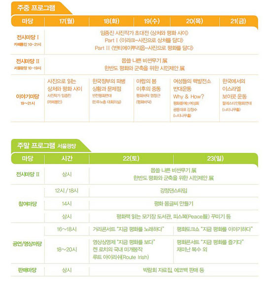 준비위원회는 마지막으로 "또한 어린이 체험프로그램을 비롯해 평화를 주제로 한 토크쇼, 콘서트, 영화상영 등 문화행사들이 개최되어 평화 만들기에 대한 시민들의 다양한 목소리를 나누는 자리가 될 예정"이라면서 많은 참여를 당부했다.
