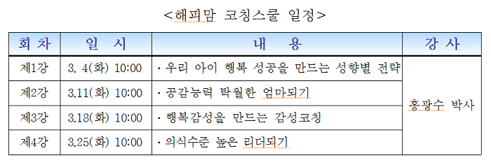 해피맘 코칭교실에 참여를 원하는 학부모는 2월 24일(월) 오전 9시부터 양천구 평생학습센터 홈페이지(http://lifestudy.yangcheon.go.kr/)틀 통해 온라인 접수(선착순 120명)하면 되며, 수강료는 무료이다.