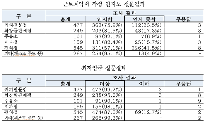 조사 결과 ‘근로계약서작성’과 ‘최저임금준수’는 대체로 잘 지켜지고 있는 것으로 나타났으며, 서면근로계약체결 등 기본 근로조건 준수에 적극적인 홍보가 필요한 것으로 나타났다. 조사를 실시한 사업장은 편의점 545개, 커피전문점 477개. 화장품판매점 249개, 제과점 159개, 주유소 101개, 패스트푸드점 등 기타 267개 등 6개 업종에서 근무하는 근로자 1798명이다. 조사대상은 여성(65%)․남성(35%)로 여성이 많았으며, 연령별로 20대(64%)․30대(20%)․40대(9%) 등으로 나타났고, 근무경력은 1~6개월(39%)이 가장 많았다. 설문조사는 ▴근로계약서 작성 ▴최저임금 ▴4대보험 ▴초과근무수당 ▴주휴수당에 대한 인지도 등 근로기준법에서 기본적으로 보장하도록 되어 있는 항목들 위주로 진행됐다. 근로기준 준수의 근간이 되는 ‘근로계약서 서면 작성’에 관해 대상 근로자의 75.3%가 인지하는 것으로 응답하였고, 대부분 근로자(94.4%)들이 최저임금(시급 4,860원/2013년 기준) 이상을 지급받고 있는 것으로 답했다. 업종별로 보면 프랜차이즈 형태로 운영되는 패스트푸드점 근로자들은 대부분 근로계약서 작성을 인지하고 있는 반면, 아르바이트 근로자가 많은 편의점의 경우 41.5%가 인지하지 못하고 있는 것으로 답했다.
