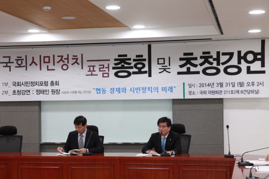 1부 국회시민정치포럼 총회에 이어 진행된 2부 초청강연회에서는 새로운 사회를 여는 연구원 정태인 원장이 진행한 특강은 “협동경제와 시민청치의 미래”라는 주제로 이루어졌다.
