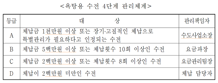 서울시는 서울시 상수도사업본부가 장기적, 고질적 수도요금 체납을 관리할 ‘체납징수팀’을 3월 신설해 이달부터 본격적인 활동에 들어간다고 9일(수) 밝혔다. 체납징수팀은 특히 200만원 이상 고액체납자와 상대적으로 물 사용량이 많고 휴‧폐업이 빈번해 고질적 체납이 빈발하는 목욕탕, 사우나 등 시설에 대한 징수 강도를 높인다는 계획이다. 현재 200만원 이상 고액체납은 총 246건, 금액으로는 26억6,400만원이다. 욕탕용 시설의 체납은 총 130건, 금액으로는 29억3,200만원이며, 이중 6회 이상 장기체납한 시설은 약 18%에 해당, 총 32건, 2억5,900만원이다. 200만원 이상 고액체납의 경우, 체납징수팀과 수도사업소 체납담당 직원이 합동으로 징수조를 구성해 특별관리하게 된다. 욕탕용 시설에 대해서는 각 수도사업소에서 매달 체납여부를 확인하고 모든 욕탕용 수전에 대해 체납요금별로 A~D까지 4단계로 분류, 관리책임자를 지정해 철저히 관리해나갈 방침이다. 도표 1