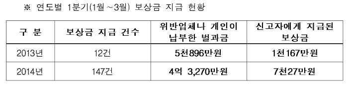 이는 국민권익위원회(위원장 이성보)가 「공익신고자 보호법」에 따라 2013년 1분기에 지급했던 보상금 1천 167만원보다 6배나 늘어난 금액이다.