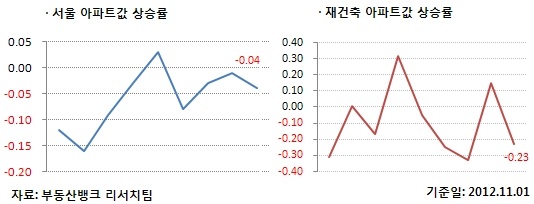 전국 아파트값이 -0.03%로 하락했다. 부동산뱅크에 따르면 11월 첫 주 아파트값 상승률은 서울 -0.04%, 수도권 -0.05%, 도지역 0.06%, 광역시 0.03%, 세종시 0.00% 등의 순이었다.