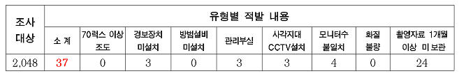 지하․건물식 주차장 CCTV 점검도 병행한 결과, 주차장법 위반한 37개소 적발 한편 서울시는 주차장법 시행규칙에 따라 30면 이상 지하식 및 건물식 주차장에 설치된 CCTV와 녹화장치 점검도 병행한 결과, 전체 2,048개소 중 37건을 적발해 18건은 시정완료하고 나머지 19건은 시정조치 중이다. 「주차장법 시행규칙 제11조」에는 30면 이상 지하식 및 건물식 주차장을 이용하는 시민의 안전을 위해 ▴70럭스 이상 조도 미유지 ▴경보․방범설비 미설치 ▴CCTV 촬영자료 1개월 이상 미보관 등 8개 항목을 점검․관리하게 되어 있다.