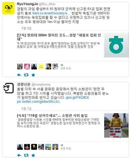 한겨레신문이 2014. 06. 09 17:08분에 보도한 "청와대 300m 떨어진 곳도…경찰 “세월호 집회 안돼"의 기사는 ”‘6·10 만인대회’ 61개 모두 불허“ “청와대는 집회 성역인가” 비판 ‘속옷탈의 강요’ 등 피해입은 8명, 인권위에 ‘경찰 인권침해’ 진정 등을 다뤘다.