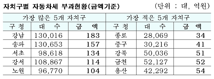 자동차세는 과세기준일(매년 6.1 및 12.1) 현재 소유자를 대상으로 매년 6월과 12월에 부과되며, 이번에 일제히 부과된 제1기분 자동차세는 등록된 자동차 182만대로 2,070억 원이며 납부기한은 6월 30일(월)이며 납부기한을 넘기면 3%의 가산금을 더 내야 한다. 이번 제1기분 자동차세의 부과 금액은 강남구, 송파구, 서초구, 강서구 순으로 많았고 종로구, 중구, 강북구, 금천구 순으로 적었으며, 강남구의 경우는 13만대 183억원이 부과된 반면 종로구의 경우는 2만8천대 34억원이 부과되었다.