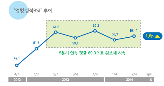 올해 2분기 실적BSI는 60.1로 이는 직전 분기(58.3)보다 1.8포인트 상승하였지만 전년 동기(61.8)에 비해서는 1.7포인트 낮은 수치로 기준치(100)에는 아직 못 미쳐 경기가 여전히 어려운 상황인 것으로 분석됐다.