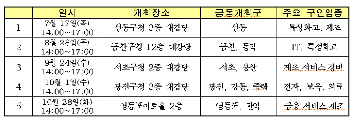 ‘찾아가는 희망취업박람회’는 7월 17일(목) 성동구를 시작으로 8월 28일(목) 금천구(금천, 동작), 9월 24일(수) 서초구(서초, 용산), 10월 1일(수) 광진구(광진, 강동, 중랑), 10월 28일(화) 영등포(영등포, 관악)에서 차례로 열린다.