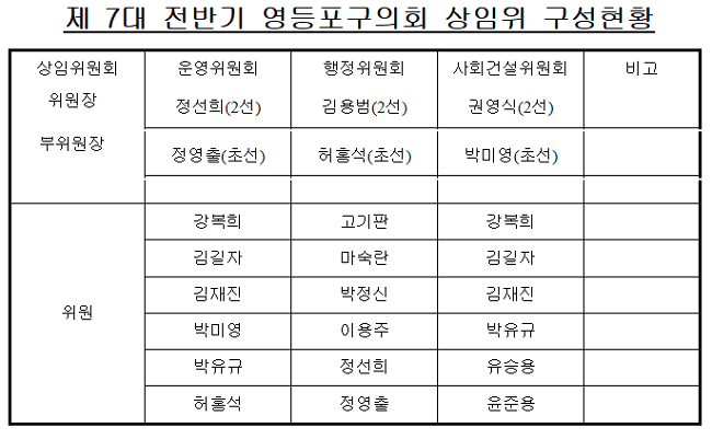 상임위원장 정선희, 김용범, 권영식 의원 선출 영등포구의회가 우여곡절 끝에 21일(월) 오후 제7대 전반기 원구성을 마치고 개원식을 가졌다.