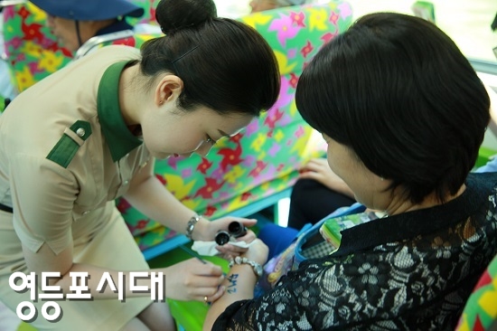 철도관광의 새로운 패러다임으로 전환하는 평화열차 DMZ-트레인 경원선 관광 전용열차가 8월 1일부터 운행에 들어간 가운데 3일(일) 오후 승무원이 열차를 이용하는 승객 팔등에 경원선 관광 전용열차의 이름인 DMZ이라는 글자를 써주고 있다.