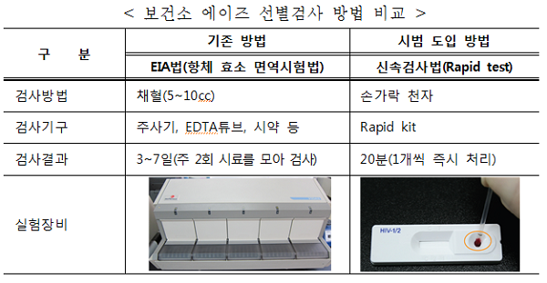 내년부터 서울시내 전체 25개 보건소에서 에이즈 검사를 누구나 무료로 받을 수 있고, 혈액 한 방울만으로 20분 만에 그 결과를 알 수 있게 된다. 특히, 본인의 희망에 따라 하는 에이즈 검사는 이름, 주민등록번호, 주소 등 인적사항을 밝히지 않는 '익명검사'로 이뤄지기 때문에 에이즈가 고민되는 사람이라면 서울시민은 물론, 거주지, 국적 등에 상관없이 누구나 검사를 받을 수 있다. 보건소 에이즈 검사법은 익명검사와 실명검사로 나뉜다. 실명검사는 유흥주점 등 종사자들의 의무 건강진단 등이다. 서울시는 결과 확인까지 3~7일 정도 걸리던 기존의 에이즈 검사를 20분 만에 간단하고 빠르게 확인하는 '신속검사법'으로 개선하는 사업을 지난 4월10일부터 4개 보건소(용산‧성동‧동대문‧영등포)에서 시범운영한데 이어, 내년에는 시내 모든 보건소로 전면 확대한다고 밝혔다. '신속검사법(Rapid test)'은 손가락 끝에서 한 방울의 혈액을 채취해 1회용 소형 검사키트에 점적한 후 에이즈 감염 가능성 유무를 판단하는 매우 편리한 방식으로, 의료기관에서 일부 사용해 왔지만 자치구 보건소에서 전면 도입하는 것은 이번이 처음이다. 기존의 EIA법(Enzyme Immunoassay, 효소면역시험법)이 혈액 5~10cc를 채혈하는 것과 다르게 채혈이 필요 없고, EIA법이 결과가 나올 때까지 약 3~7일이 걸리는 데 비해 20분이면 결과를 확인할 수 있다는 장점이 있다.
