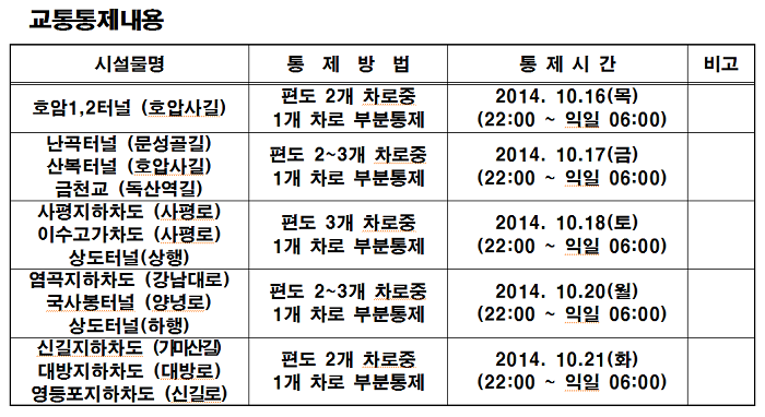 서울특별시 남부도로사업소에서는 평소 차량의 통행으로 인한 매연, 분진 등으로 도시미관 및 환경을 저해하는 호암1터널 외 13개 시설물에 대해 밝고 쾌적한 도로환경을 조성코자 세척작업을 시행함에 따라 10월 16일(목) ~ 10월 21일(화)까지 교통을 부분 통제한다고 13일(월) 밝혔다. 영등포구 지하차도 부분 통제 구간은 신길지하차도(가마산길), 대방지하차도(대방로), 영등포지하차도(신길로) 등은 편도 2개 차로 중 1개 차로이며 2014. 10월 21(화) 22:00 ~ 다음날 06:00 시까지이다.